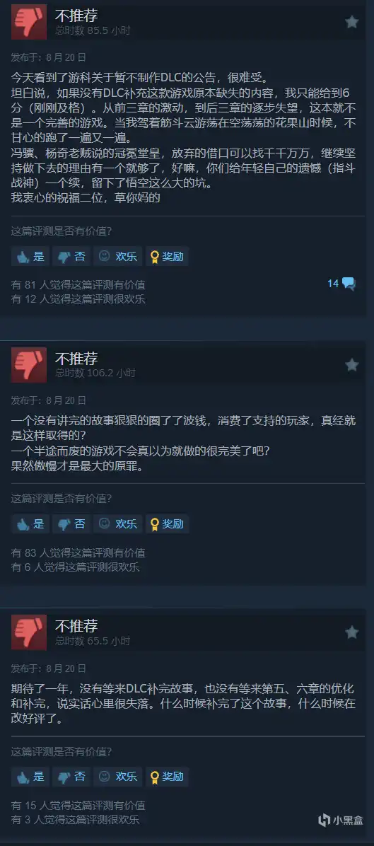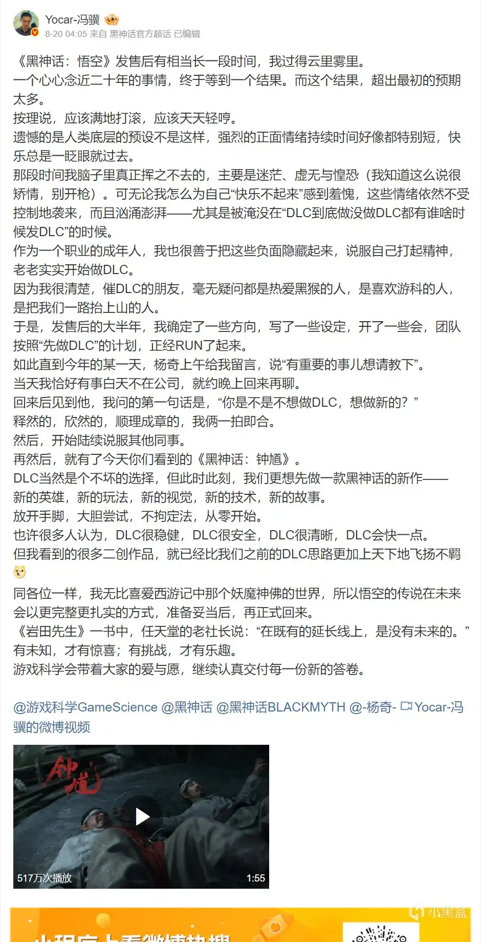 可以看出,此次差评节奏真正的原因是来自于部分《悟空》玩家对于dlc计划胎死腹中的失望,而观察冯骥在8.20的微博也可以看出,此次决定也是游科的一个重大转变,放弃了一个肯定会火的dlc计划,选择了构建黑神话的全新宇宙。