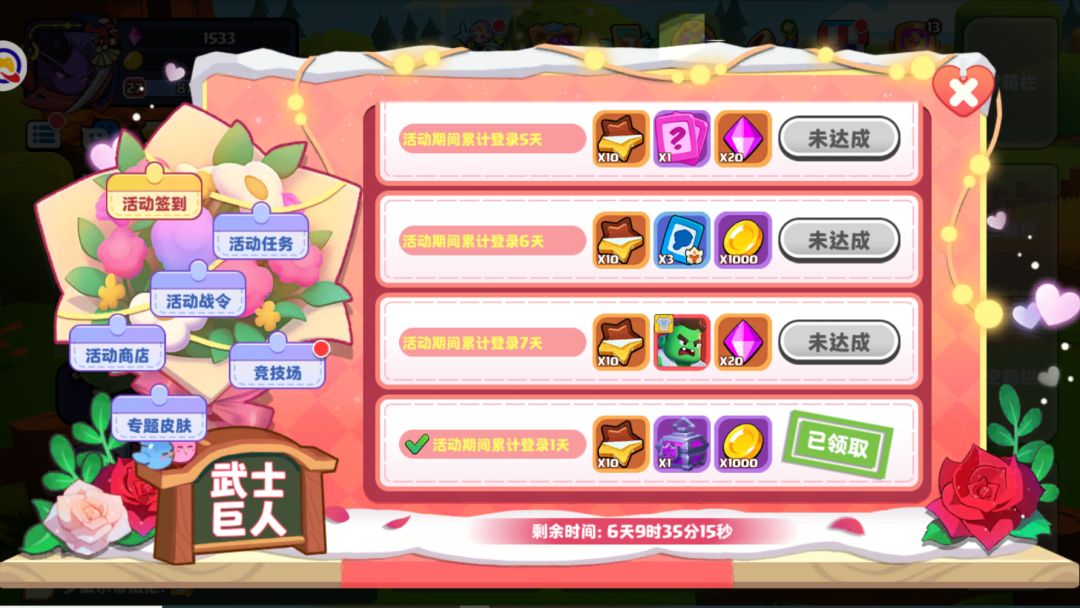 累计签到7天,可以拿到70个巧克力、60紫钻、5个戒指等奖励,戒指可以在活动商店兑换丰厚的奖励哦~第一天的签到奖励极为丰富,还没签到的冒险家们抓紧了,动动小手把福利拿下!!!