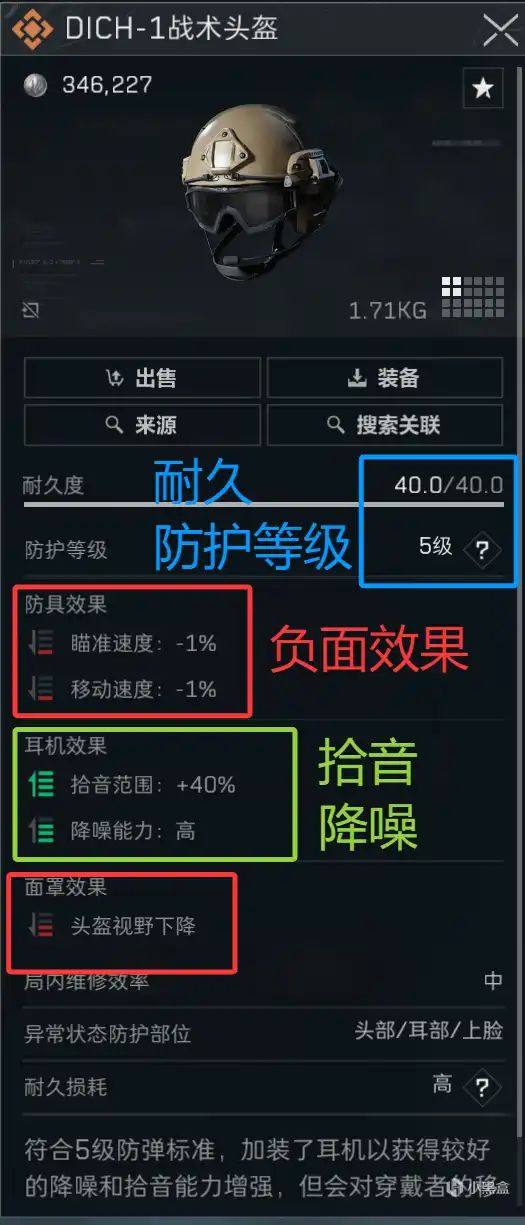 而如何读懂每一个数据并学会如何选择头盔就显得尤为重要。耐久:头盔可以阻挡伤害的余量防护等级:防弹等级,同级头盔减免50%爆头伤害,低一级头盔减免25%爆头伤害(乌鸡蛋打四级头),高一级头盔减免所有爆头伤害(狙除外)。注意:头盔伤害的减免是建立在耐久足够的前提下。只有40以上的五级头耐久才能抗一枪金蛋狙不倒地。拾音范围:听力增强范围,如跑步脚步无头盔50米能听到,拾音加50%在75米时就有细微脚步。降噪能力:脚步声音放大、杂音去除的能力防具效果:头盔负面效果(减移速、瞄准速度)面罩效果:视野遮挡(挡屏幕)