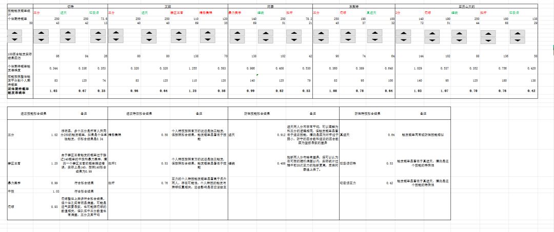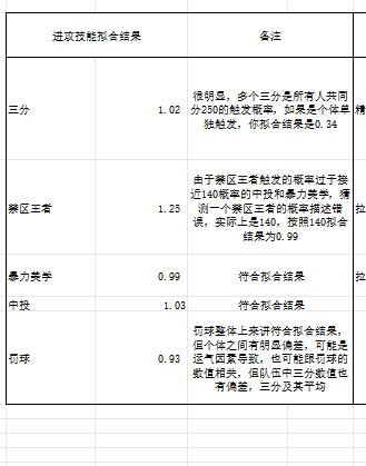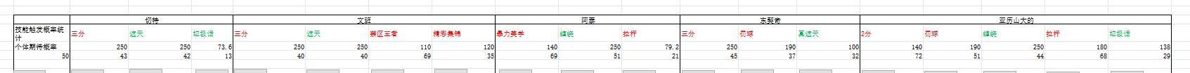 1. 确认了三个三分技能是队伍共享触发概率,也就是实际上三个三分每个人的触发概率是83,技能属于团队触发,单挂技能的触发频率显著高于多个技能叠加。