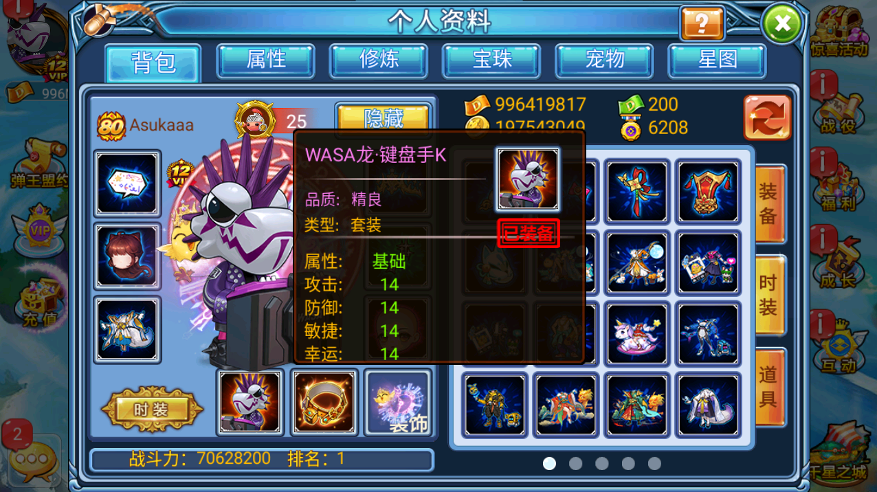 在弹射王里,「WASA龙·键盘手K」不仅赋予角色炫酷外观,更带来扎实的属性,助你在对战中打出行云流水般的连续操作,每一次弹射是按键般的精准触发,穿上后,战力显著攀升,无论是竞技场还是副本挑战,都能让你从容应对,如键盘手般冷静输出。