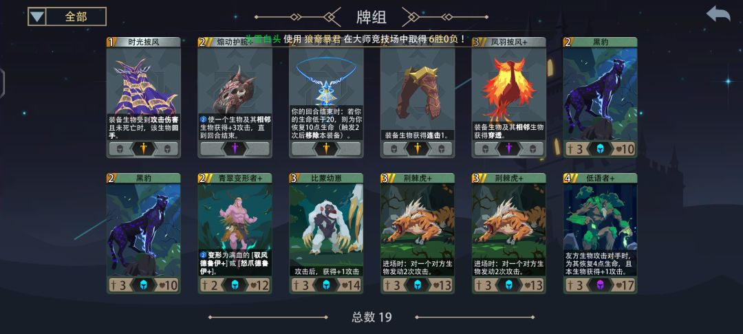 卡组构筑:开局删两恐狼 抽两次生物和一次装备 尽量抽一个3费打手开局 实在抽不到就拿山岭巨人或独角兽这样的4费打手过渡也行 如果能拿到好的生物装备(毁灭之斧 魔蛇手套)可以直接开局 前期有余钱就先升荆棘虎方便解梦魇 金币充足可以考虑拿一张穿透卡(飞行术&凤羽披风)来应对邪影术士