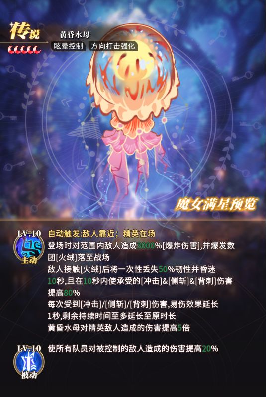 黄昏水母属于传说品质,相对来说提升高星级更容易;把握释放时机,【狂热之魂】在场骑士每秒释放一次【异端处决】,可以让黄昏水母【火绒】被动延长,打出更多伤害。