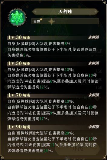 天秤座的反弹球和大型球增伤适合特蕾西娅,首次撞击在下半场时能叠加【冲击伤害】;伤害类型增幅和弹球类型都适合特蕾西娅。