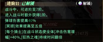 每有一个骑士处于战斗状态,使全体冲击【冲击伤害增幅40%】;处于【狂热之魂】时冲击伤害增幅200%,9阶时提升至400%。