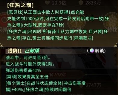 战斗中进入6阶,骑士力竭时每秒发射1枚【恶灵球】;每名骑士力竭期间能发射12枚【恶灵球】,期间能额外发射60枚【恶灵球】,能极大限度地提升【狂热之魂】的充能。