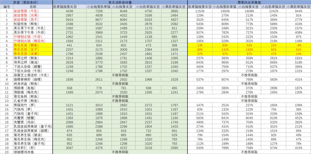 并计算单天需要多少额外采集效率才能保持食材手机量等于消耗量。(采集值取单小时采集最高量,如牛乳为5.9/小时,不计算季节加成与月卡加成,数据来源白菜菊花)