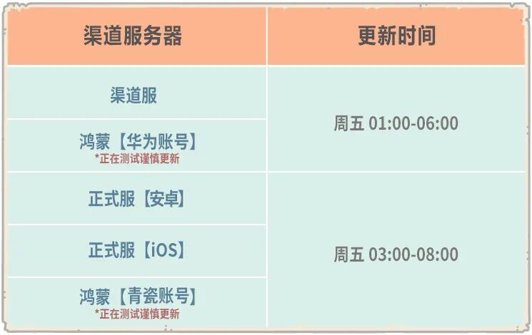 我们预计在本周五(12月19日)对服务器进行停机维护,为了确保版本稳定性,我们将错开不同渠道服务器的更新时间,本次正式服各渠道更新时间如下: