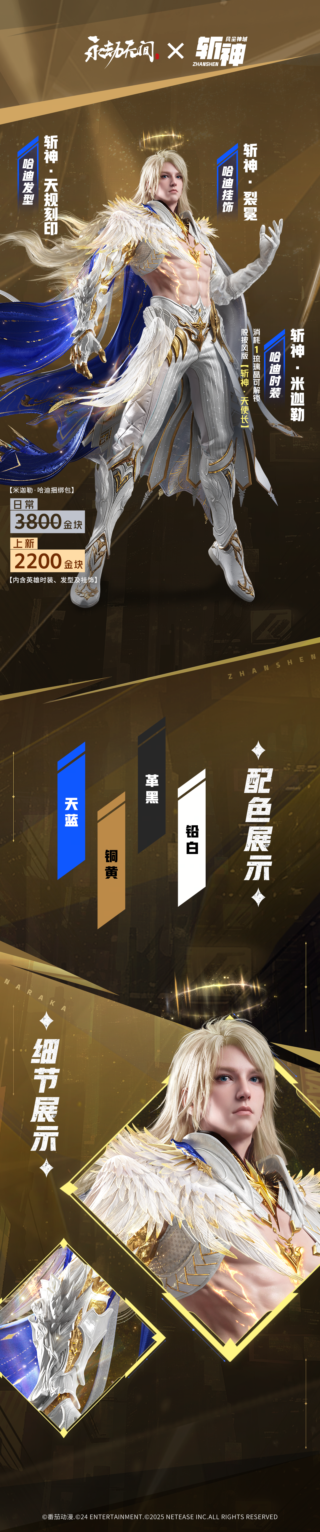 “诡计之神” 司小南以蓝梦外观亮相,玩家获取基础时装后,消耗 1 琉璃晶即可解锁帅气流畅的脱披风版本。哈迪・米迦勒捆绑包则重现神明代号003 “炽天使米迦勒” 的荣光,内含专属技能、奥义特效挂饰,让玩家体验翱翔战场的快感。