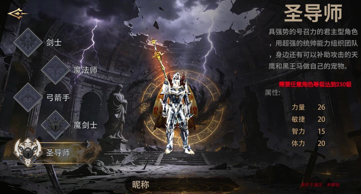 魔剑士与圣导师则是游戏中的高阶职业,解锁条件分别为任意角色等级达到220级与250级。魔剑士是复合型角色,融合了战士的勇气与魔法师的智慧,力量、敏捷、智力、体力四项属性均为26,既能近身厮杀,又能释放多种魔法,玩法极具多样性;圣导师是拥有强势号召力的君主型角色,凭借超强的统帅能力组织团队,还能召唤天鹰和黑王马作为宠物辅助攻击,力量26的数值也让其具备一定的近战能力,是团队中的战术指挥核心。
