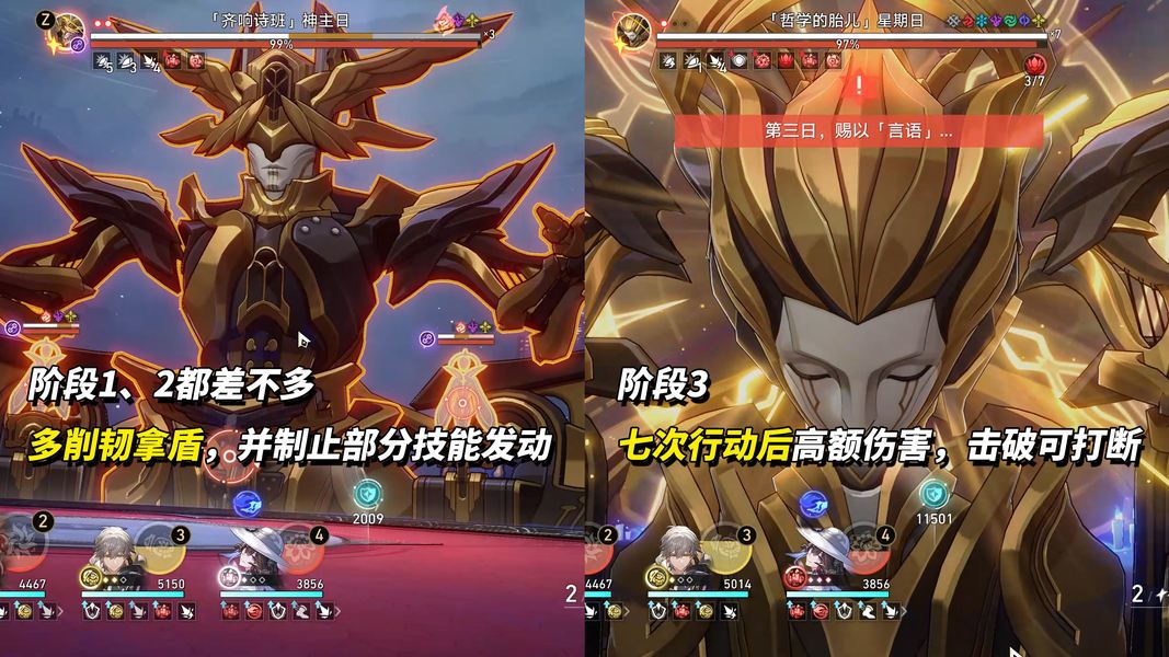 此次对敌神主日,共3个阶段,前2个阶段为「火=雷=虚数」属性优势,阶段3则是全属性弱点激活。对局中可通过削减敌方韧性条获得护盾,属性契合且削韧强的队伍可考虑无生存打法。