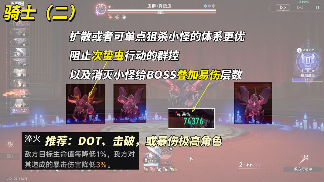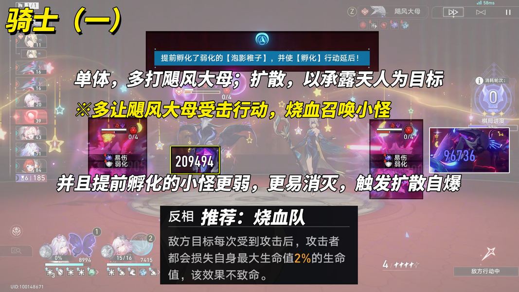 骑士(三)优势属性「虚数>物理>冰」,敌方无特殊抗性。环境异常,6次受击立即行动,敌方攻击造成5%或10%推条效果。