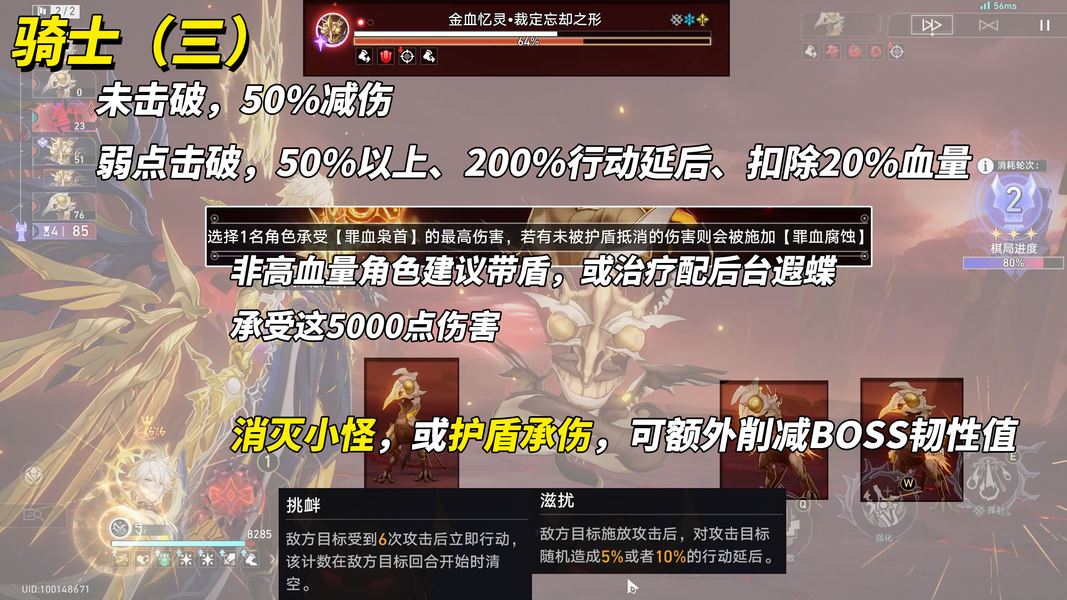 难点在第2波金血忆灵·裁定忘却之形,对局中未破韧状态下有50%减伤,通过消灭召唤物、盾承伤都可额外削韧。进入弱点击破状态则会扣除20%血量,并延后200%行动、50%易伤。