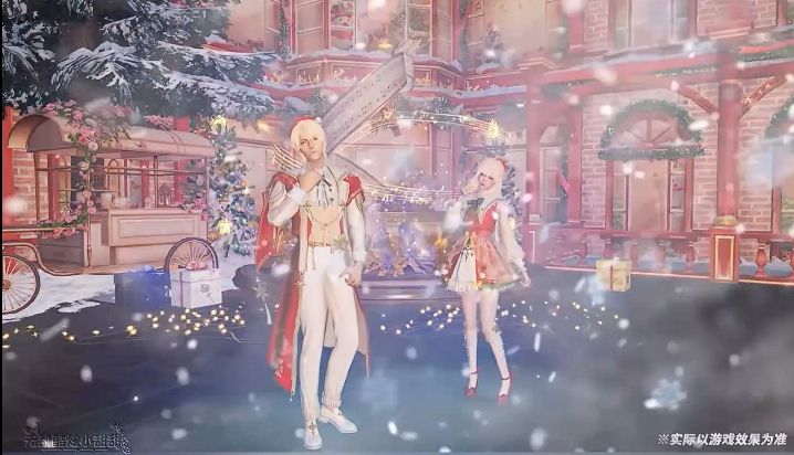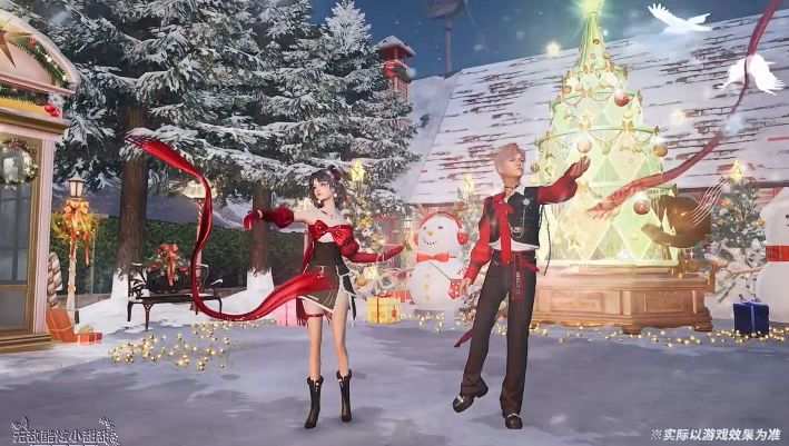 「诞愿有你」则主打现代美学,红黑粗花呢礼服缀满碎钻光泽,胸前巨大红缎蝴蝶结与珍珠链条,将圣诞华丽感拉满。时装还支持自由染色,走路时自带雪花飘落特效,待机时触发专属互动动作。