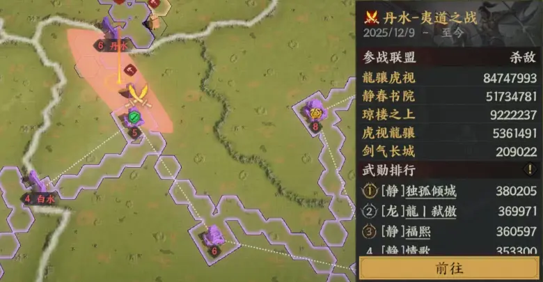 S2-46区则是本期的反转专场。【静春书院】和【龍骧虎视】本是并肩作战的盟友,可江汉大战后,他们却联合了【琼楼之上】,一同对抗起了【龍骧虎视】。关口解锁后,三方同时宣战丹水,【龍骧虎视】面临着两个满编盟的人数压制,处境十分艰难。