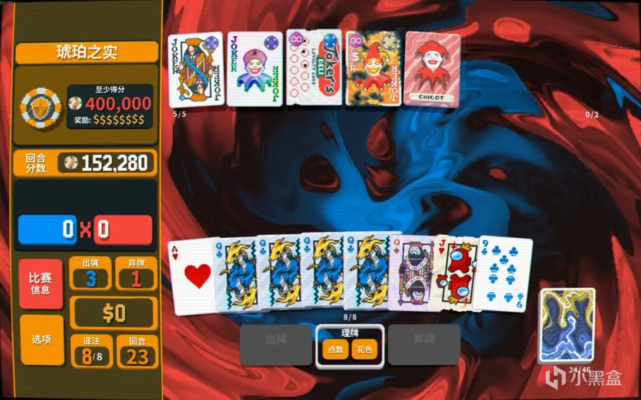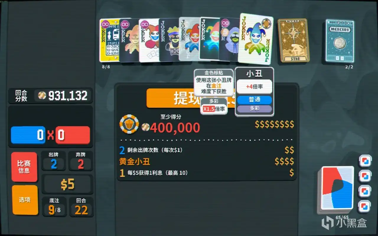 接着是算分顺序,首先从打出的手牌处算分(注意,这里的手牌也是从左到右计分的,因此如果有计分的多彩牌,应该把他放在最右边),接着是从剩下的手牌处算分(如钢铁牌,哑剧演员,男爵等),最后是从小丑牌端算分。