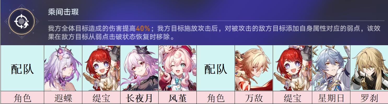 其三是提供全队增伤,我方每次攻击,都会给BOSS添加攻击者的弱点属性。比较泛用的buff,可以给遐蝶等不吃攻击也不吃击破的角色使用。
