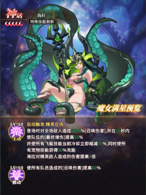 ⭐主动技能:海拉登场造成召唤伤害,并且持续期间提升全队【最终增伤】;大幅度缩短飞艇冷却并提供大量宠物技能充能。