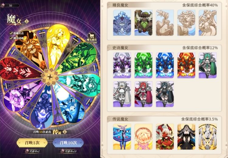 消耗咒语书抽取魔女和魔女精华(上附概率图),抽到重复魔女则为20个碎片;并且每次抽取获得1个魔女之心,集齐500个可以兑换一个神话魔女。