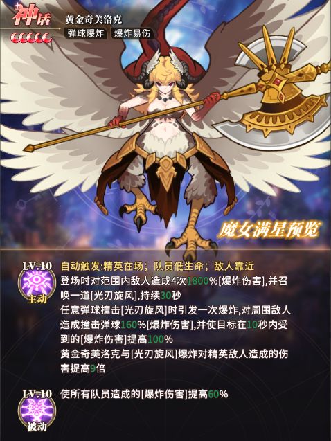 💡小技巧:黄金奇美洛克为伤害类女神,作为解场女神,在场面紧张时缓解压力,配合弹球造成爆炸易伤。上阵顺序可以在前三,较大范围的伤害,能够帮助前期过渡。适合菲迪爆炸队。