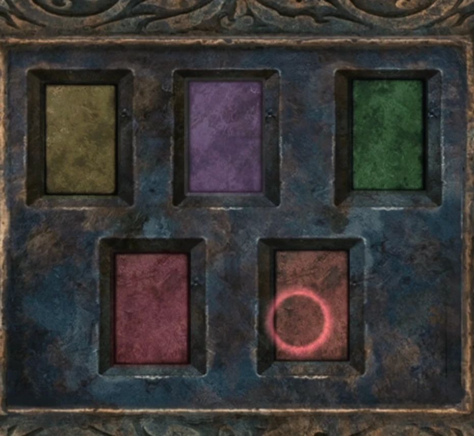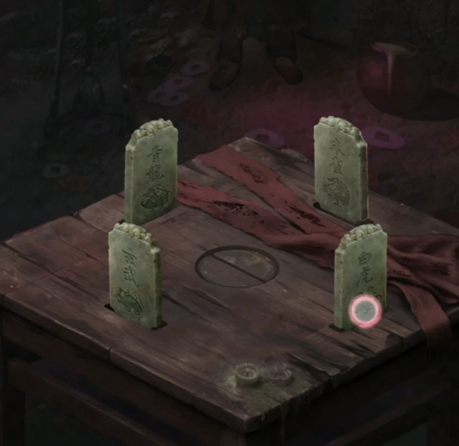 然后查看一下右边桌子上的机关盒子,我们前面走廊燃烧的线索是【金黄、紫、绿/红,土黄】,就按这个调整一下盒子上的五个色块,调整完毕如下图拿到【白虎】牌子,回到烧火间查看左边的桌子使用三个牌子。