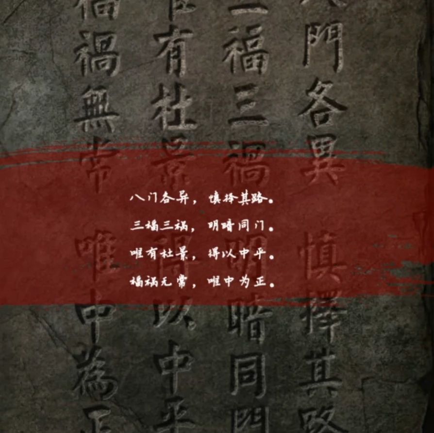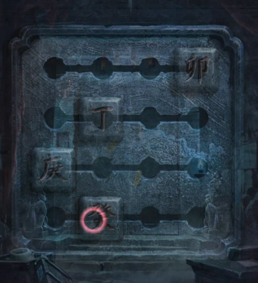 这里我们要结合方向和固定不动的【朱雀】,因为朱雀是南,也就是右上角是南,左下角是北玄武,右下角是西白虎,左上角是东青龙,都放好后如下图,中间拿到【土】木牌,来到走廊后向后走到镇墓兽场景,对门右侧的机关使用【土】木牌后调整位置。