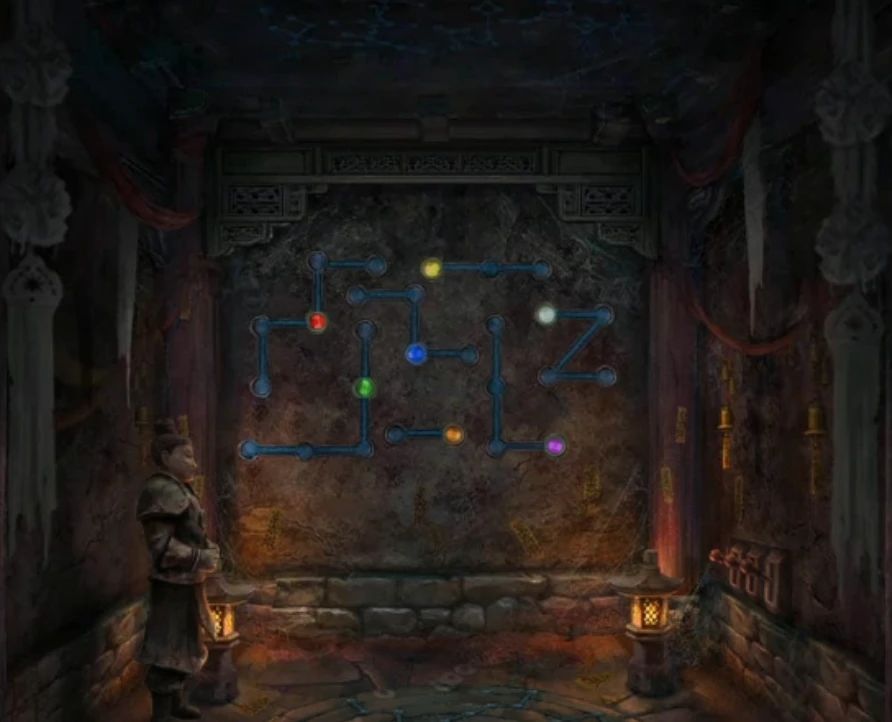 等全部亮起后查看后面的墙壁,最好是画一下颜色和位置,我们前面已经看过了五行和颜色的对照【金=黄,木=绿,水=蓝,火=红,土=褐】,记下来后后退一下到有水的场景,对左上角的石棺使用【尖刀】去除藤蔓后获得【青龙】牌子,再次点击竹子还能再拿一根【枯竹】,后退到走廊后左转,把【章氏】牌子放在大门左边空格里。