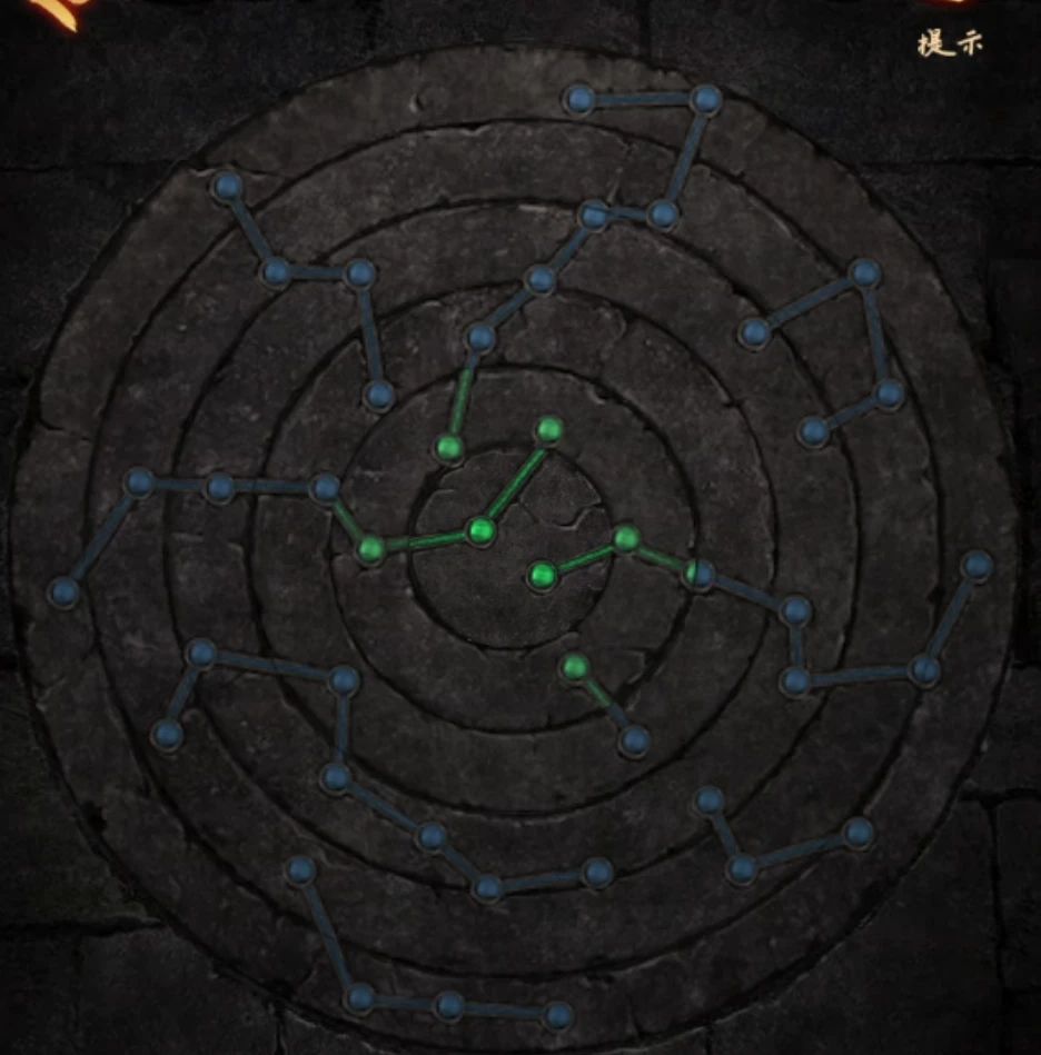 试验完后一直往前走进入刚刚打开的暗门,对左边雕像使用【木板年画】后获得【章氏】牌子,注意退出的时候雕像睁眼小高能不要被吓到,对中间绿色小方块使用【枯竹】后获得【玄武】牌子,查看右边的墙壁触发机关调整星盘,调整好后如下图。