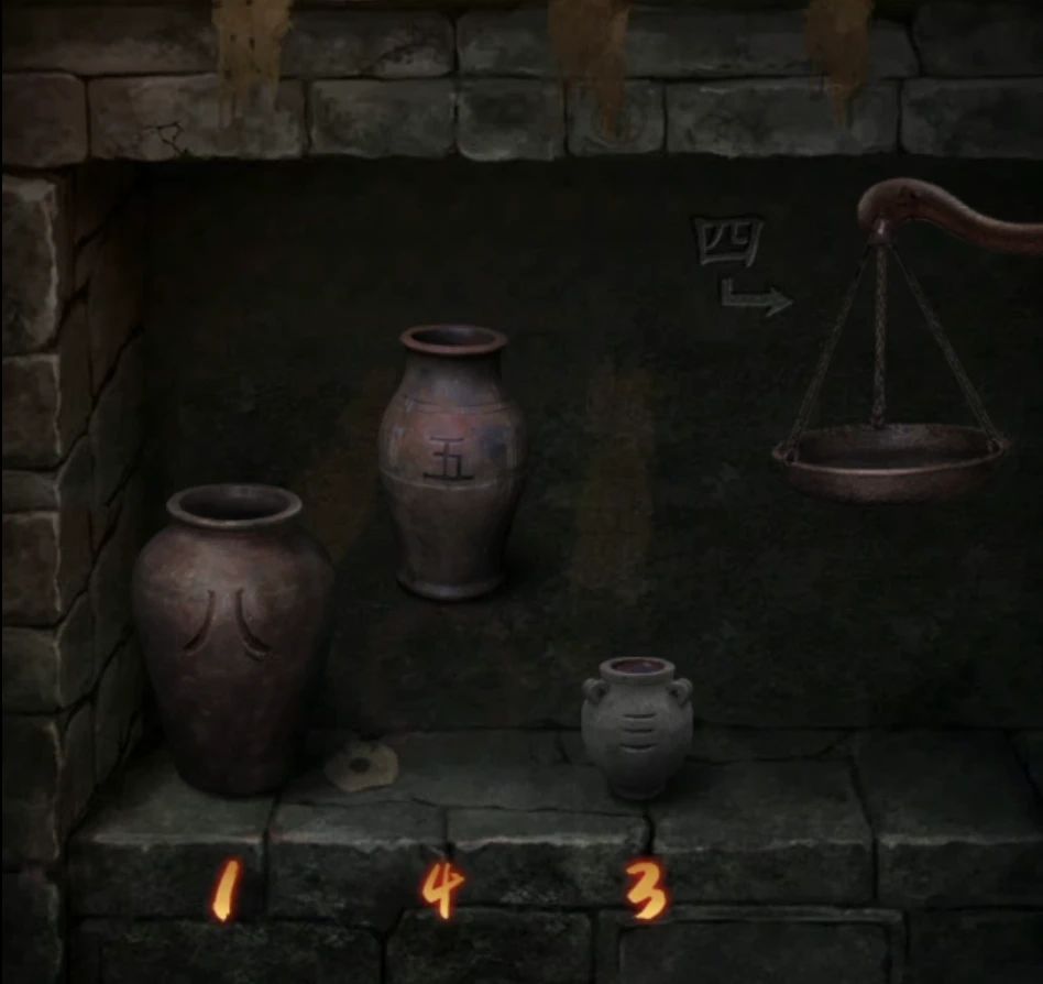 后退来到走廊,对左边靠前的门使用【有水的陶瓷壶】给门降降温就能开门了,开门进入有个假人微笑小高能注意,左边桌子上拿到一块【木板年画】,对右边的几个罐子使用【陶瓷壶】后再次点击进行一个盛水小游戏,需要的是4单位的水,调整一下如下图把水放到右边获得【八卦盘】。