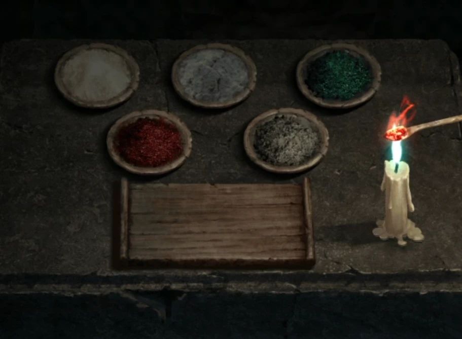 再次回到走廊场景,对左边箱子上右下角有烛泪的地方使用【点燃的蜡烛】后就可以开始实验了,依次点击5个小碟子,记下来燃烧的颜色为【金黄、紫、绿/红,土黄】,所以真的建议解谜游戏不要选择类似颜色啊,左上角和右下角的颜色真的很像很容易混淆。