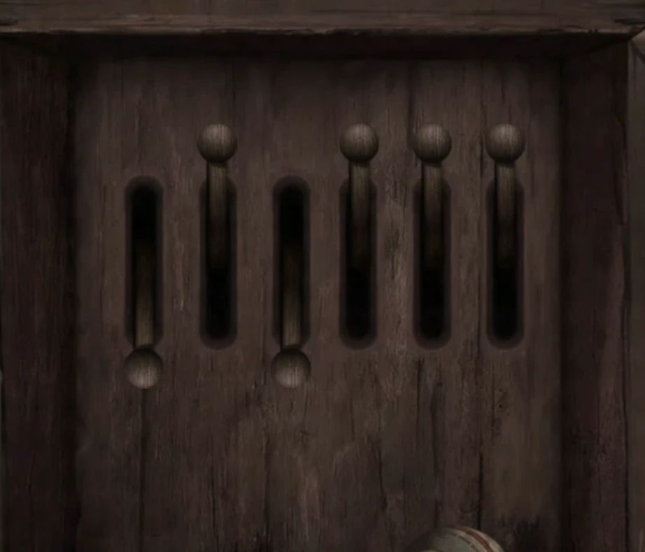 查看左上角的竹子使用【尖刀】后小高能注意,再次使用可以获得【枯竹】,回到走廊场景左转进入烧火间,对烛火使用【蜡烛】后获得【点燃的蜡烛】,先不着急走查看假人旁边的锁,使用【钥匙】后开锁看到一个机关,对应的就是我们书上红色箭头【下上下上上下】,调整一下机关如下图(最后一个再点一下)自动跳到大门位置,选择【杜景】开门后回到走廊。