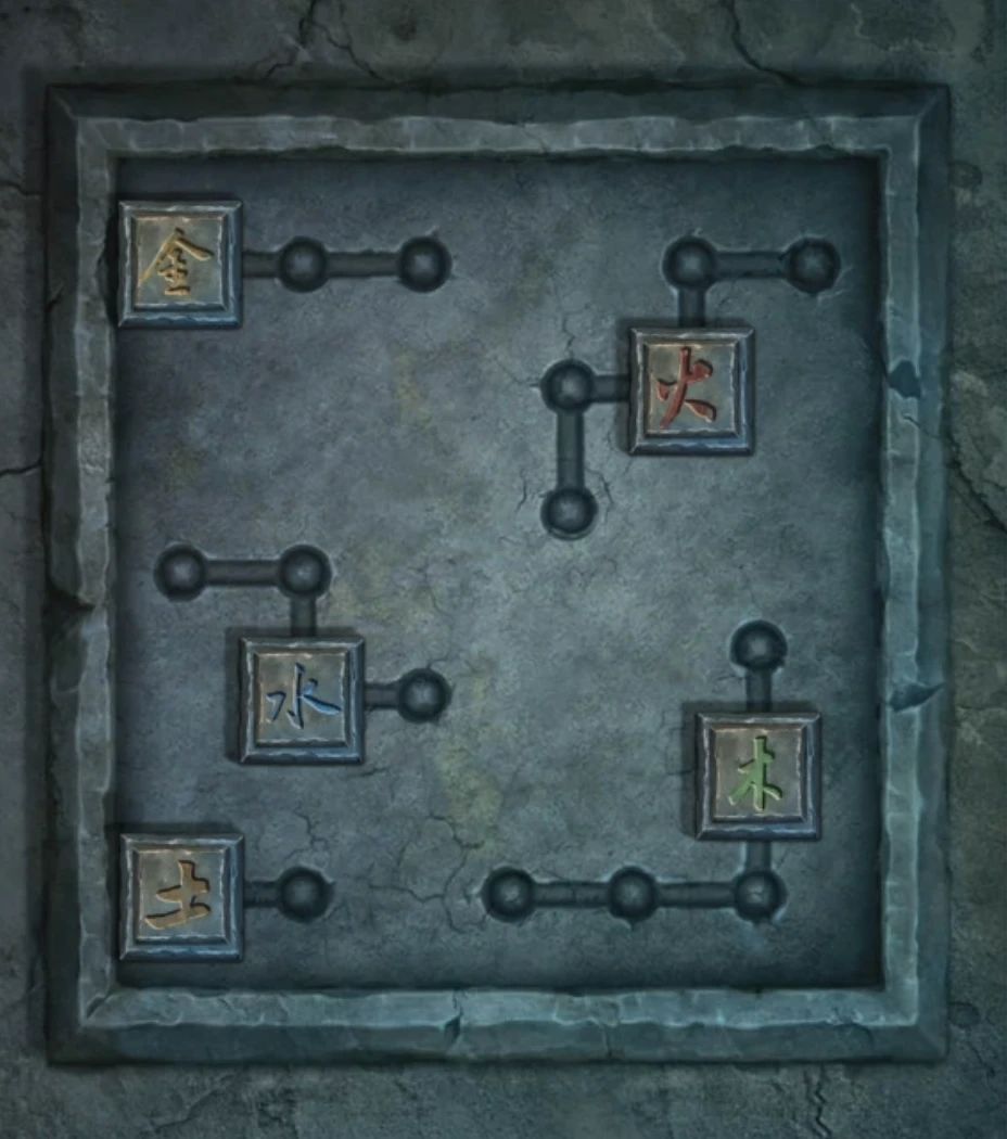 这个位置就是我们调整好星盘后对应的位置,颜色已经说过了【金=黄,木=绿,水=蓝,火=红,土=褐】,也就是金在最左边,火在中间,水在下面左边,木在右边中间,土在右侧,调整完毕后如下图(再点一下土)又打开一个门,进门本章结束。