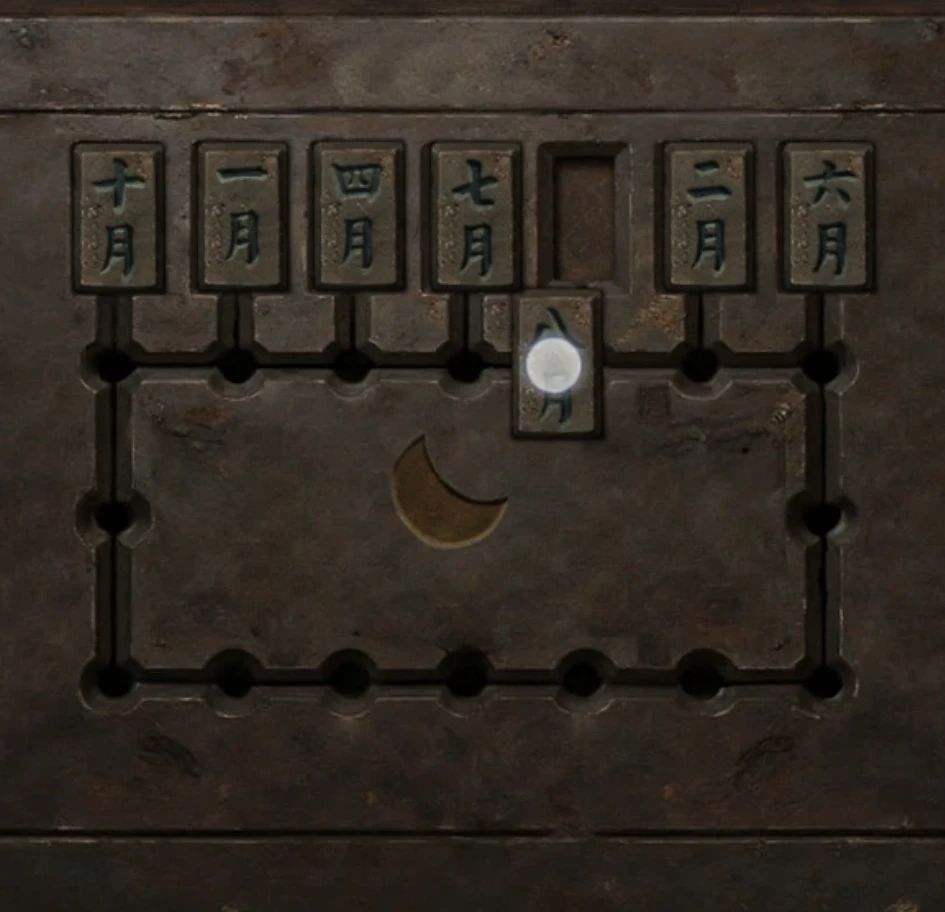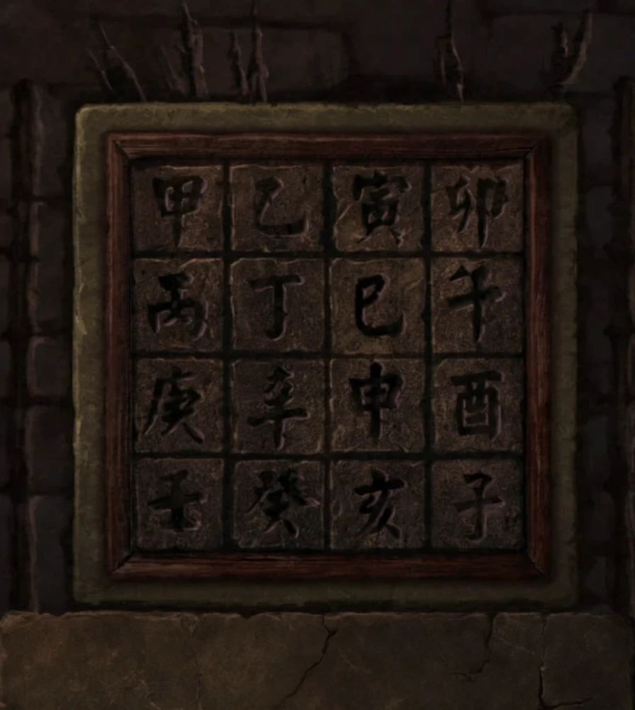 旁边的几个机关也看一下大体了解一下,然后转身到走廊把【长柄勺】放在左边箱子的木托盘上,查看左边中间位置,使用【铲子】后可以获得一个4x4的文字方块,前面有个机关的线索是【卯丁庚癸】,刚好是出现在从上到下1234行,所以这个的左右记下来【4212】