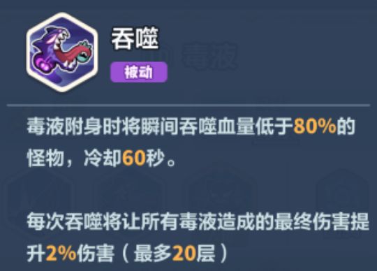 毒液核心增伤机制,斩杀低血量怪物,获得可叠加的终伤buff(全毒液共享),直接决定角色下限与上限。