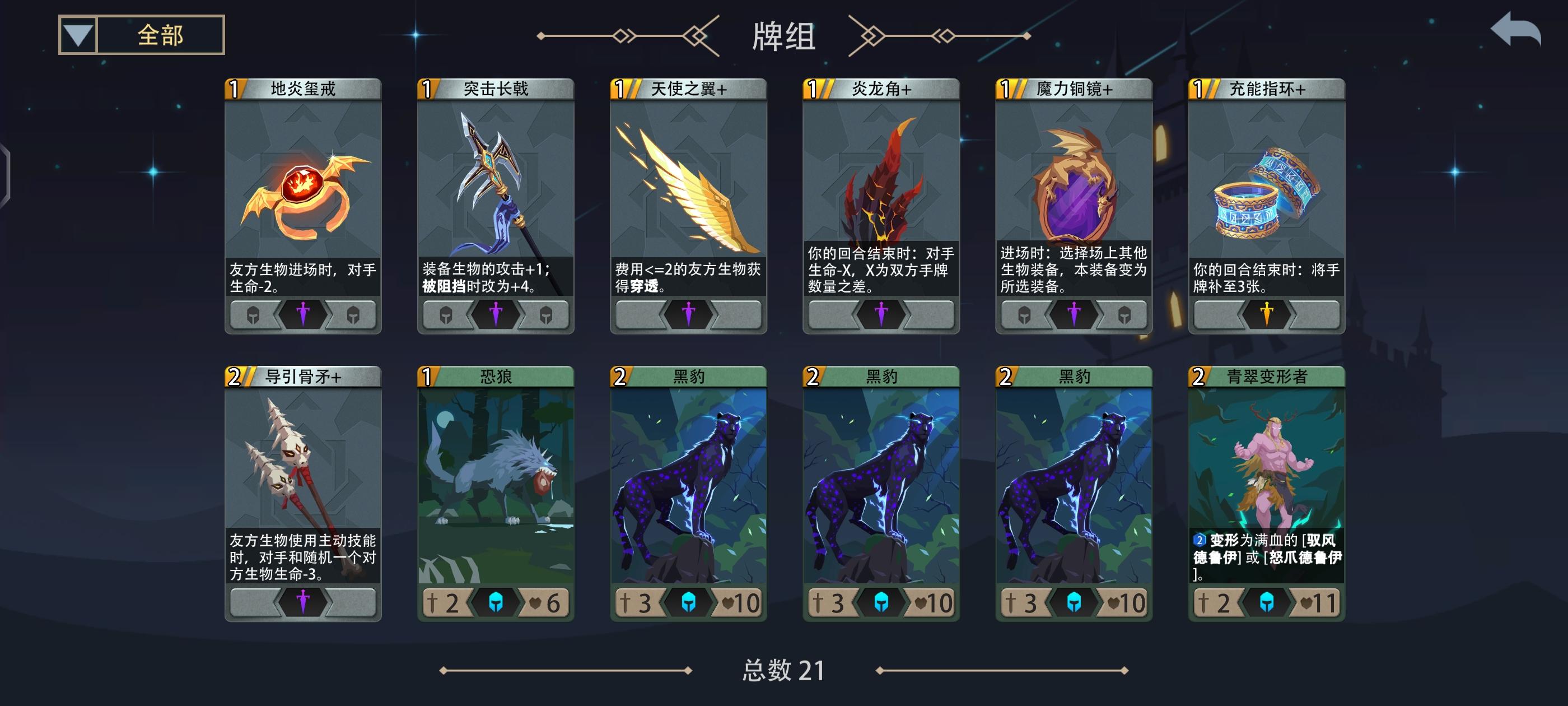 理想卡组:过牌(2~3张)buff卡(3张)生物装备(3张)角色装备(1~2张)卡组厚度(18~20张)
