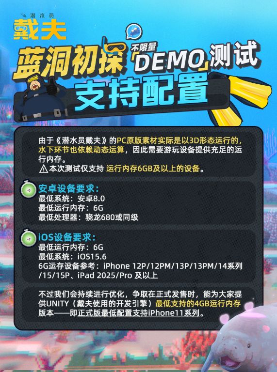 全球销量破600万份的海洋冒险神作《潜水员戴夫》,近日官宣手机版不限量公开Demo测试将于12月19日14点正式开启,Android与iOS双端玩家均可参与,测试玩家还能在正式版解锁寿司店新摆件纪念品。
