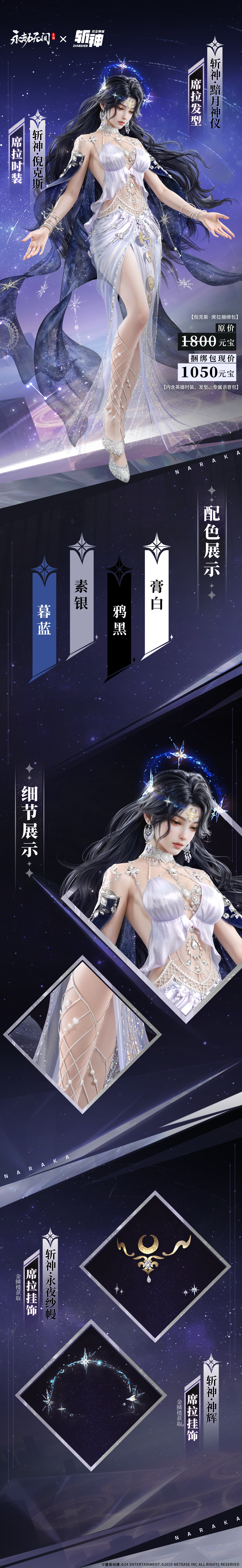 柔润月光织就的长裙圣洁幽雅,漫天星河尽作朦胧纱袂,腰畔银链与鎏金挂饰更衬得神祇冷艳。举手投足间,满是慈爱与温柔。