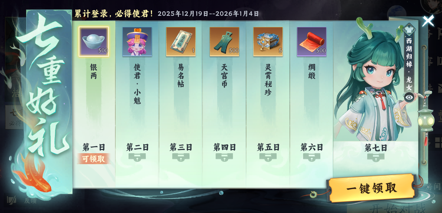 测试期间,每日登录送七重测试福利,限定使君形象、银两、易名贴、天宫币、凌霄秘珍等登陆福利,累计七日还可获绝品使君形象【西湖归棹·龙女】。