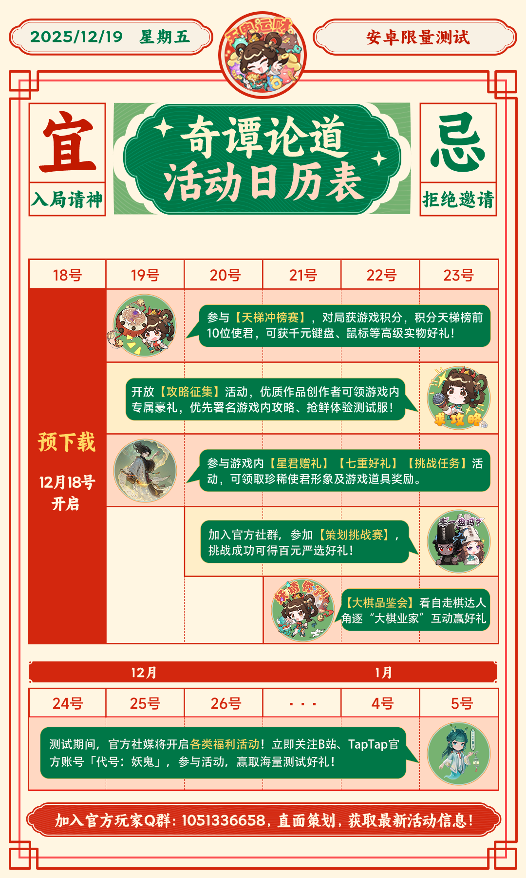 为了欢迎各位使君们的到来,阿音又双叒叕来给大家发福利啦——多重好礼覆盖整个测试期,错过就亏大了!话不多说,阿音已精心整理出《奇谭论道活动日历》,让各位使君大人从妖鬼世界满载而归,尽情畅享福利盛宴!