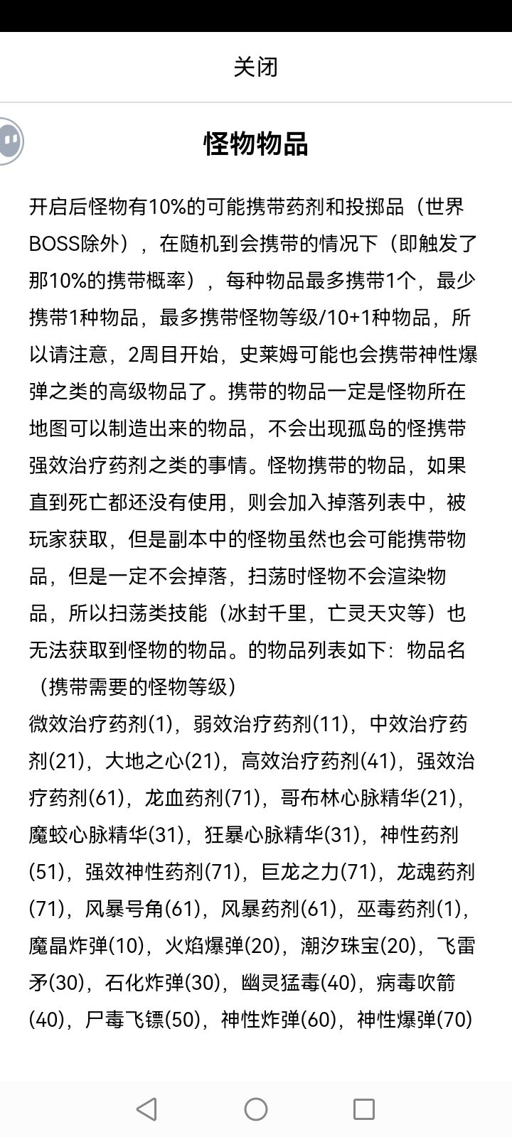 每个怪物都有10%概率携带物品(世界boss和克系神不会携带,副本怪会使用但不会掉落),具体内容如图。