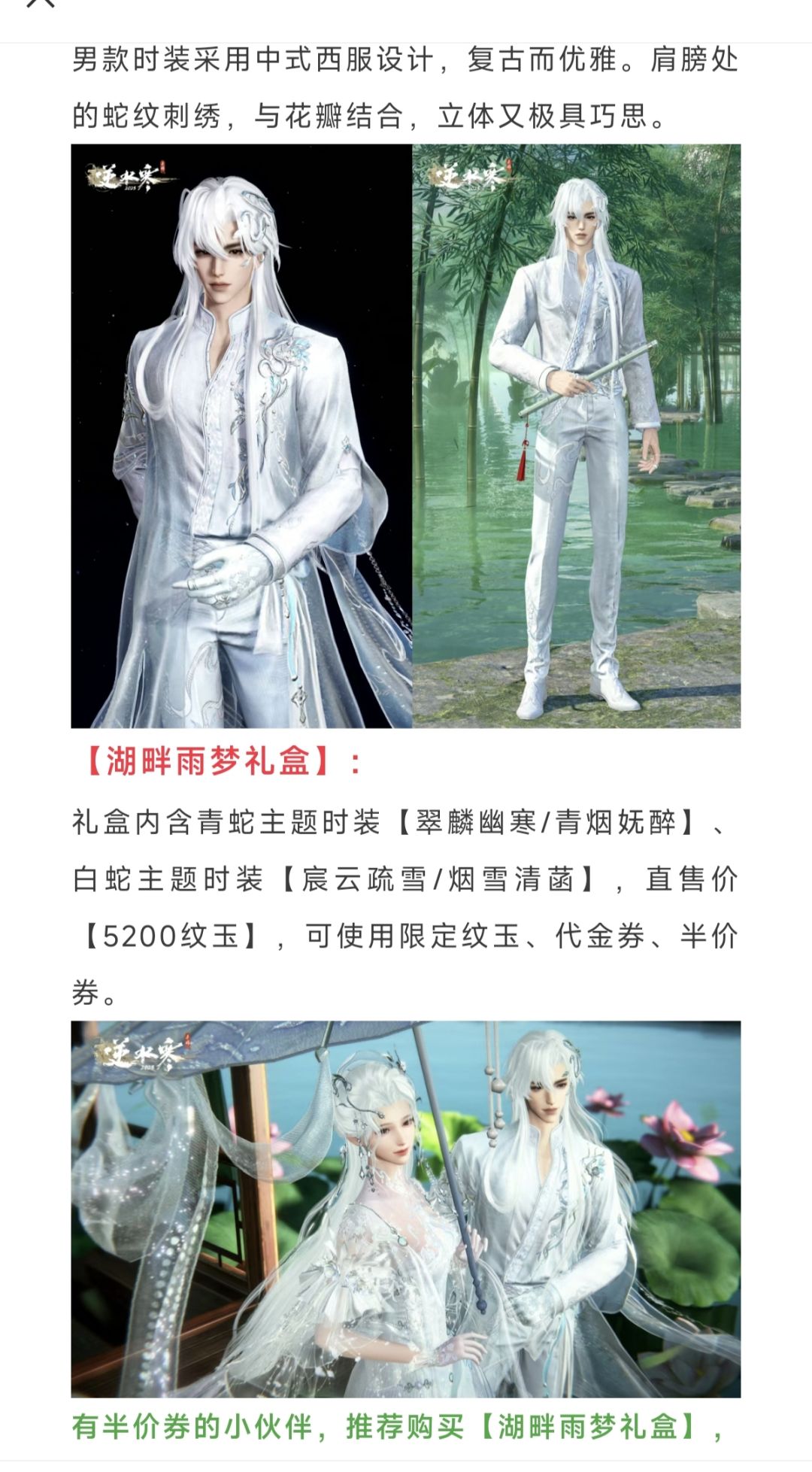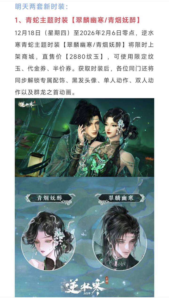 逆水寒手游青蛇/白蛇主题明天上线,售价288块仅需130块,下周限定外观返场投票,明天18个绑凿获取合集!