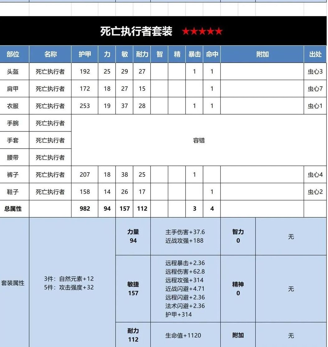 4,套装:血刃三件套(衣服,腿,护腕)激活出元素自然伤害12,可以选择手套或者腰带,力量鞋子必备。