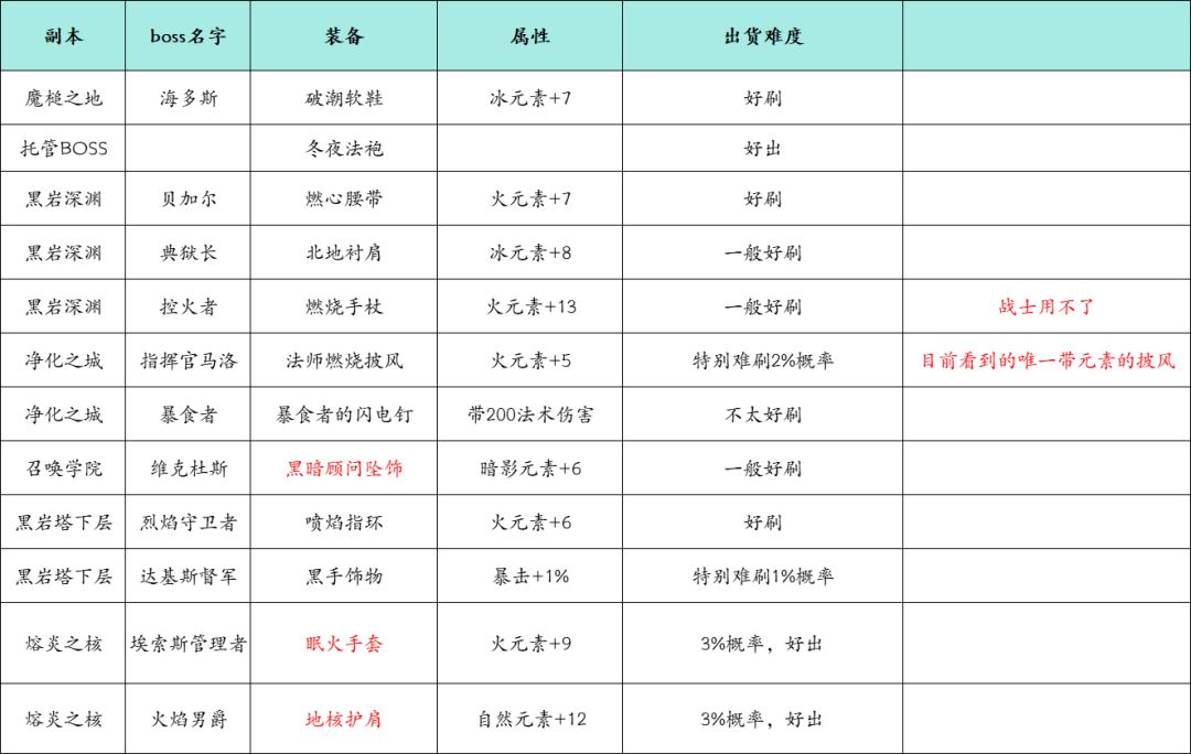 5,元素装备:9元素眠火护手,地核肩膀,备选毁灭头,备选夜影刺客头,元素谜语腰带。世界BOSS的元素护腿。