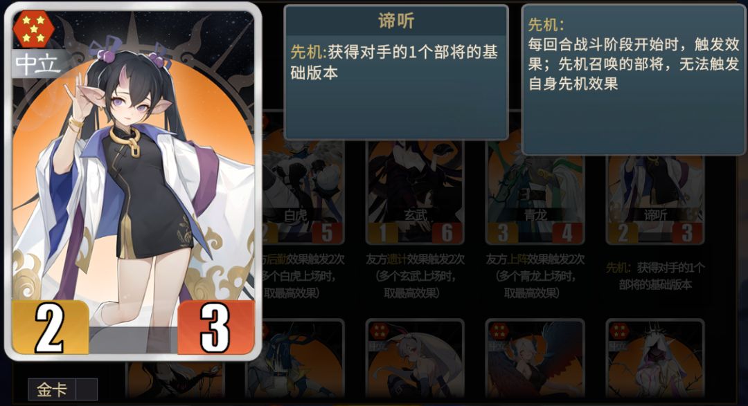 ★中立流派的核心之一。中立玩法分为以烛龙为核心的锦囊流,和以麒麟为核心的部将流,但是随着麒麟升级为六星,谛听的上阵改为先机,麒麟中立渐渐没落,成为了时代的眼泪。