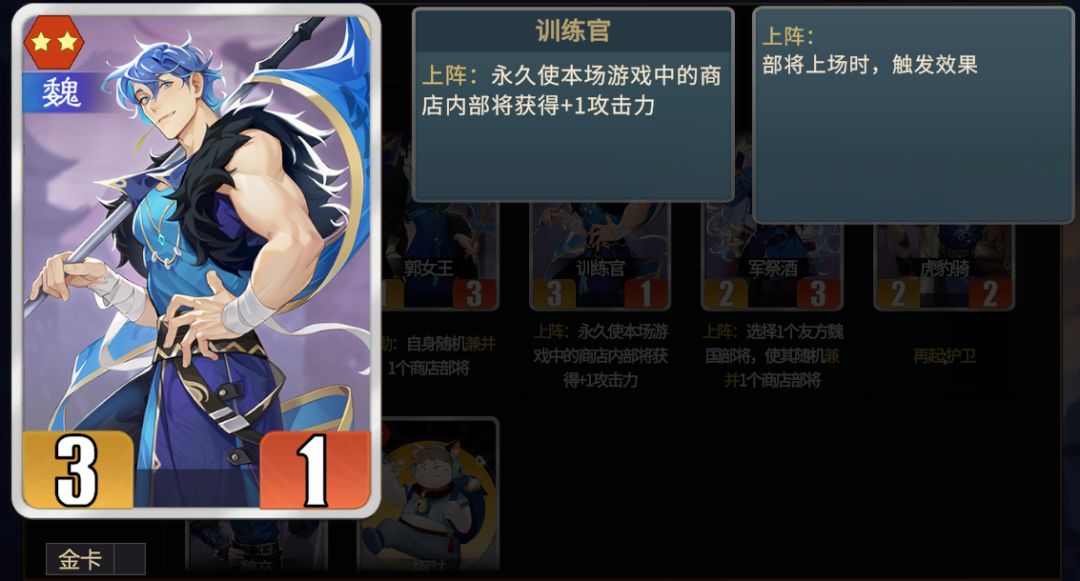 ★上阵魏:这版本训练官只加攻击,上阵魏多用于搭配军祭酒触发多次兼并,或者郭嘉理财,实际作用不算太大。