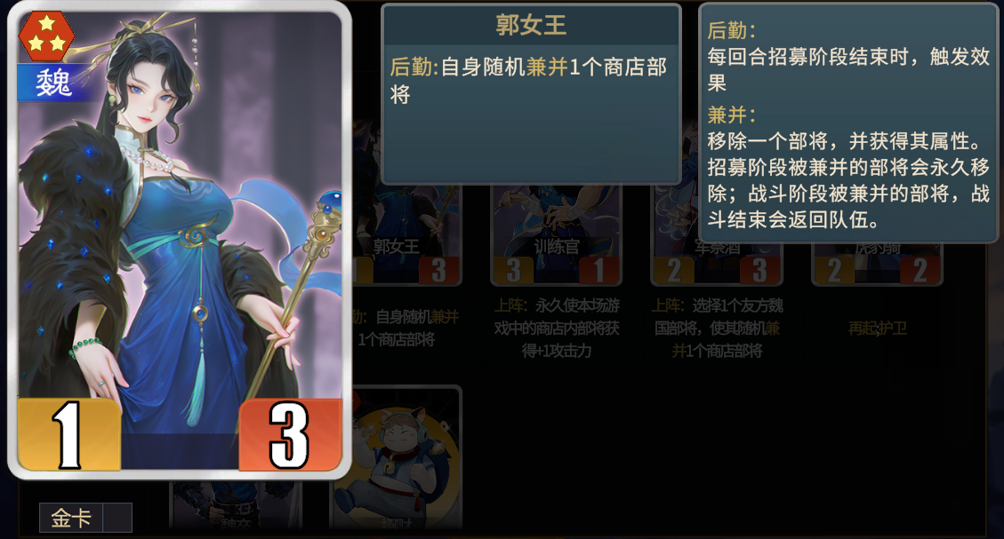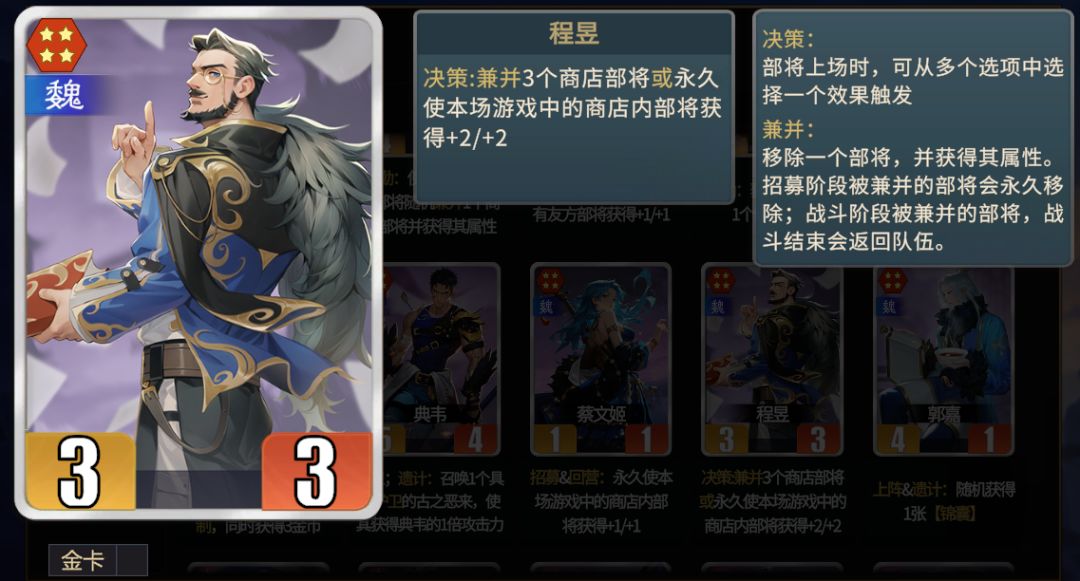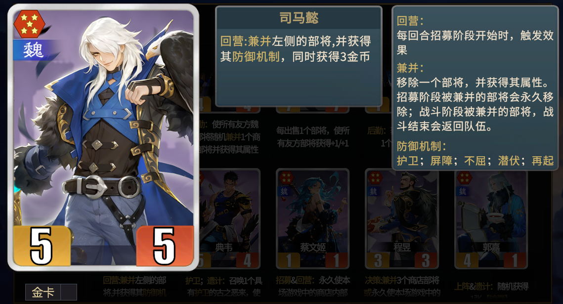 ★后期可以作为许褚当回合最后一个粮食,后期兼并一轮后,回营被司马懿兼并然后理财,腾出空间进行下一回合的养成。
