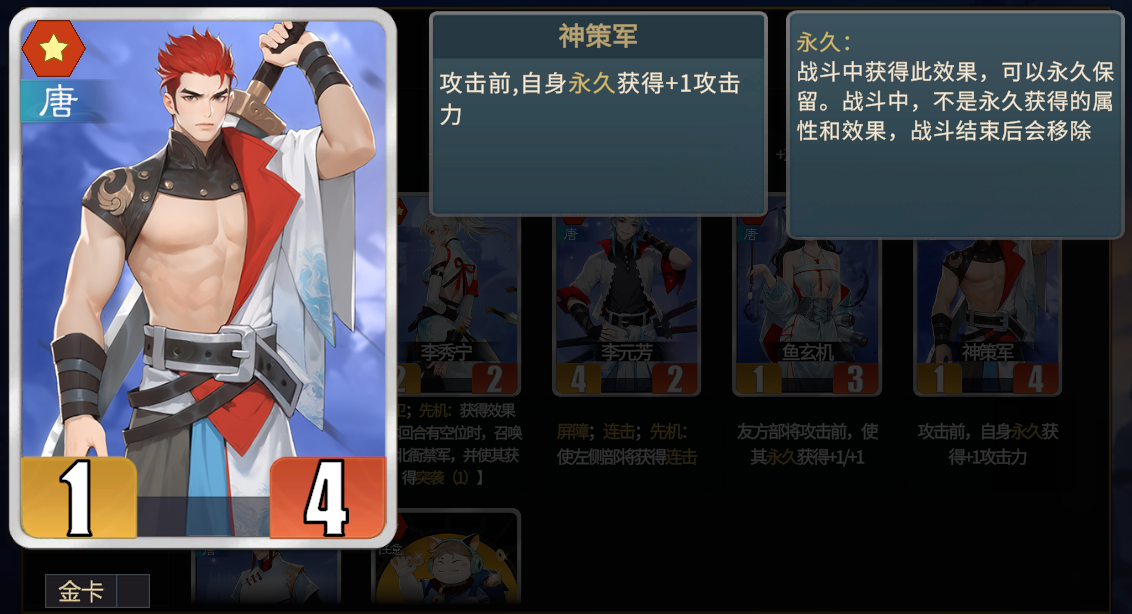 ★神策军初始只有1点攻击,更适合能够抬属性的统帅,否则容易憋死。