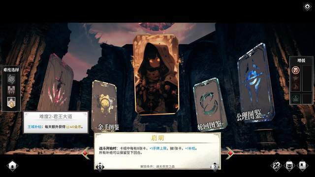 通关或者是失败重新开局时你可以更换开局英雄,初始是金石,每2回合+1武装+1补给,还可以在命运、维特琳、安度瑞尔、秩序、启明、先驱、凯撒、吉尔伽美什、摩根娜和精卫中进行选择,但是注意,新手只能选前三个,后续英雄想要使用有自己的解锁条件,比如安度瑞尔就是需要通关启程,精卫更是需要通关冰晶山脉才能解锁。