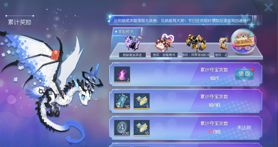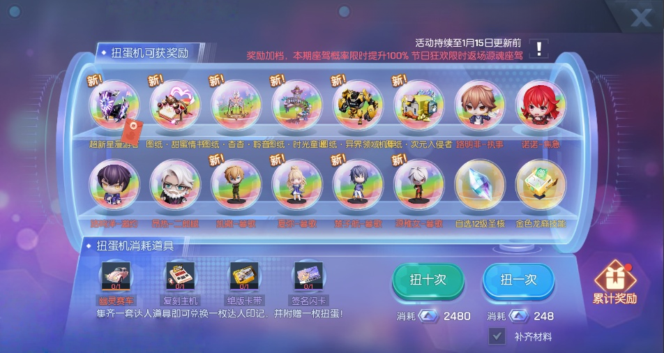 累计扭蛋次数可领取时光座驾碎片、虚像结晶、幻视结晶、重构晶格、梦幻手办匣、诫律重塑道具、金色龙裔技能等珍稀奖励,集齐一定数量的时光座驾碎片可兑换当期扭蛋机座驾「本期限时返场的源魂座驾除外」,每期活动会重置扭蛋的次数和累计奖励,但时光座驾碎片可长期获得和使用!