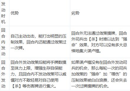 然而,谋卢植虽然既可以选择回合内自己主动对对方使用伤害牌之后发动司兵,也可以选择在回合外被攻击后发动司兵,但敛策每轮只能发动一次,因此谋卢植一定要考虑好是在回合内自己主动出击时发动敛策,还是在回合外还击时发动敛策。